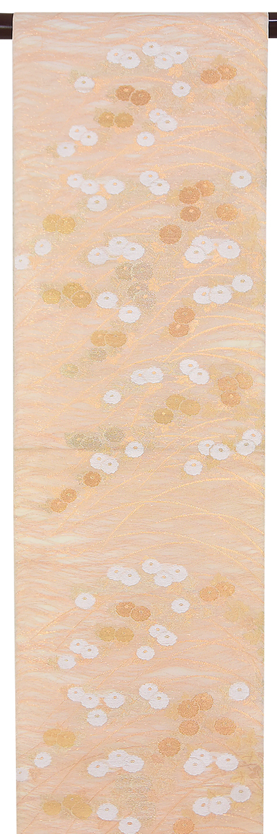 シャリ感のある手触りの良質な生成り紗織り地織りに、万寿菊などの枝花の柄を生成りに薄い黄緑の色箔糸や金糸を加え重ね織りした品。