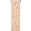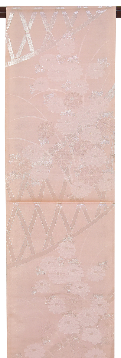 シャリ感のある手触りで朱鷺(とき)色に銀の引き箔を重ねた紗織り地織りに、生け垣に枝花の柄を地色濃淡に銀糸を加え重ね織りした品。