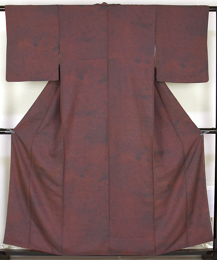 スベリの良い手触りで光沢のある小さな真砂の地柄をフクレ織りで織り込んだ紋意匠の生地を紫みの墨ネズに地染めし、色紙重ねに枝花などの柄を丹色の点描きで重ね染めした品。八掛けは正絹丹色無地で胴裏は正絹が付いた手縫い仕立て。