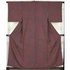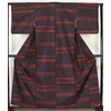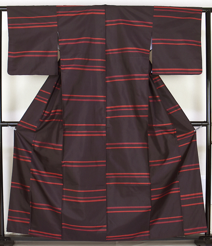 張りのある手触りで確りと打ち込まれた紫みのこげ茶の平紬の地織りに、横線柄をエンジ色で重ね織りした品。八掛けは正絹エンジ色無地で胴裏は正絹が付いた手縫い仕立て。