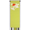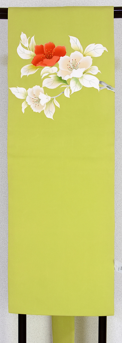 しなやかな手触りの塩瀬の生地を鶸(ひわ)色に地染めし、お太鼓の花の柄を生成りや丹色・モスグリーンなどで重ね染めした品。
