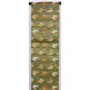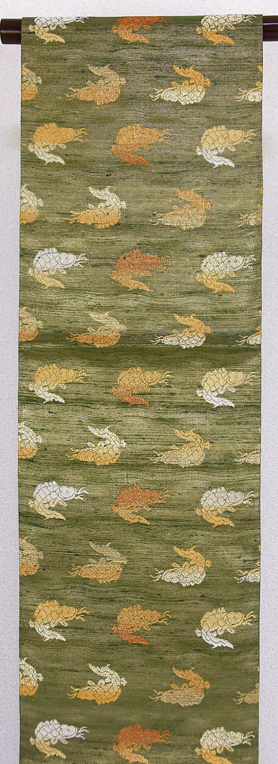 シャリ感のある手触りの緑青色と金濃淡引き箔に金糸を加えた薄手の変わり織り地織りに、名物裂の荒磯の柄を裏葉色や黄丹色の色箔糸に金銀糸を加え重ね織りした品。