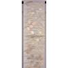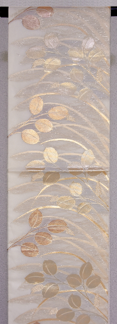 シャリ感のある手触りの生成り絽織り地織りに、萩の枝花の柄を金の引き箔で重ね織りした品。