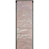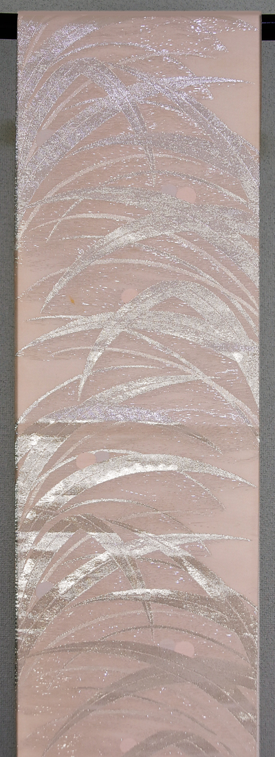 シャリ感のある手触りの薄い朱鷺(とき)色絽織り地織りに、露芝の柄を薄い藤色に銀糸を加え重ね織りした品。