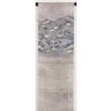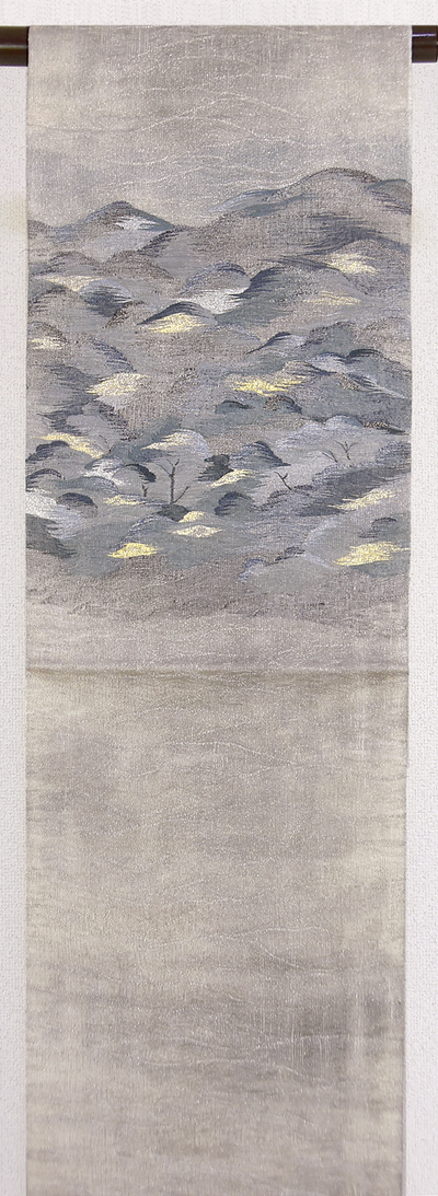 シャリ感のある手触りで銀ネズに横曲線柄を銀糸で重ねた櫛織り地織りに、お太鼓の遠山重ねに木立の柄を地色濃淡や木賊(とくさ)色、鉄紺に金銀糸を加え重ね織りした品。