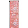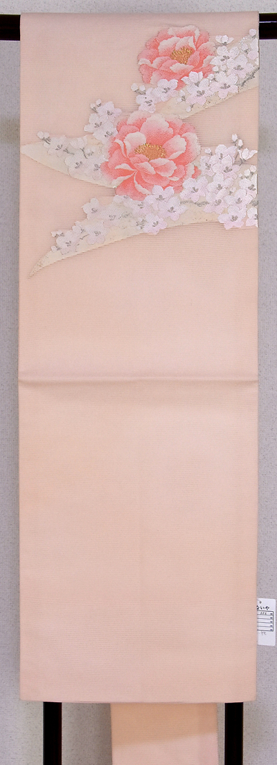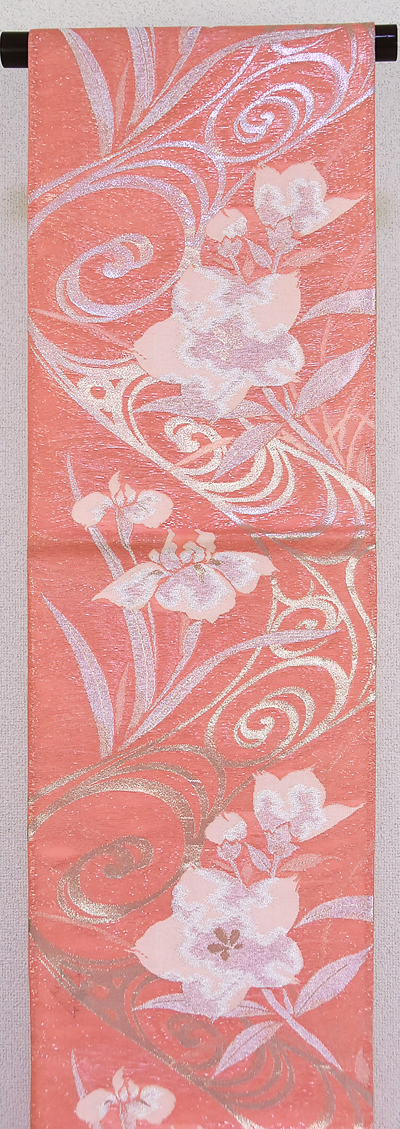 シャリ感のある手触りの薄い朱鷺(とき)色絽織りの地織りに、お太鼓の枝花の柄を珊瑚色濃淡に金銀糸を加え可愛く重ね織りした品。