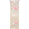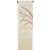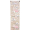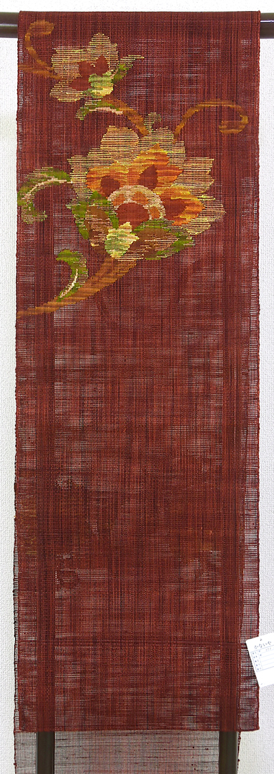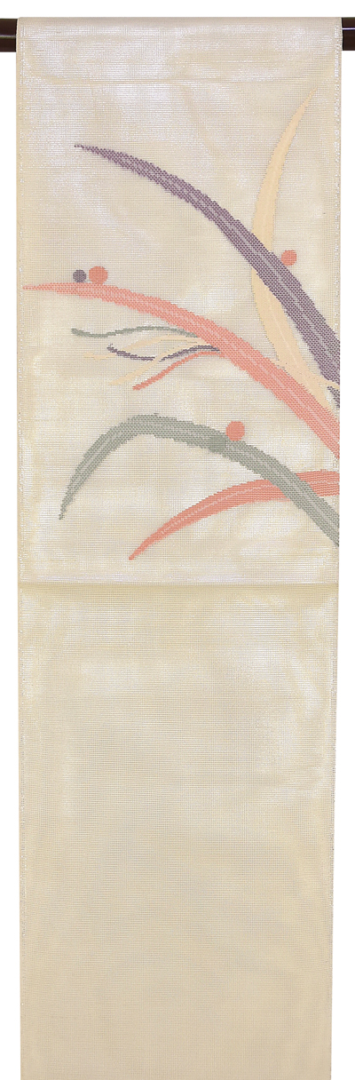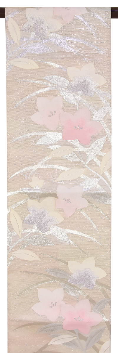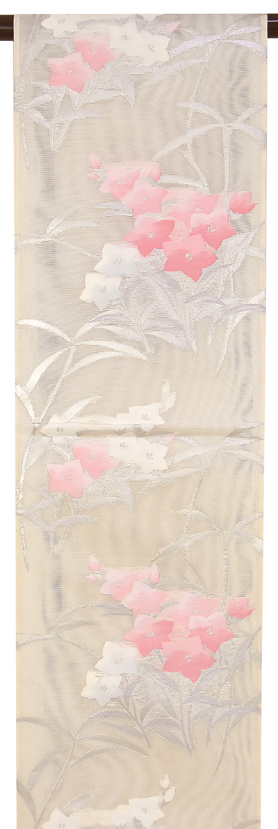 シャリ感のある手触りの生成り紗織り地織りに、桔梗の柄を紅梅色や白ネズ、薄い藤色に銀糸を加え重ね織りした品。