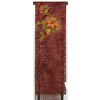 ザックリとした手触りで横糸にフシ糸を織り込んだエンジ夏紬地織りに、お太鼓の枝花の柄を地色濃淡に黄丹色やオリーブグリーン、山吹色などを加え重ね織りした、松葉仕立ての品。