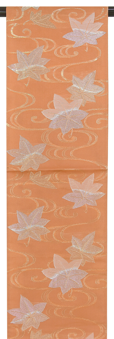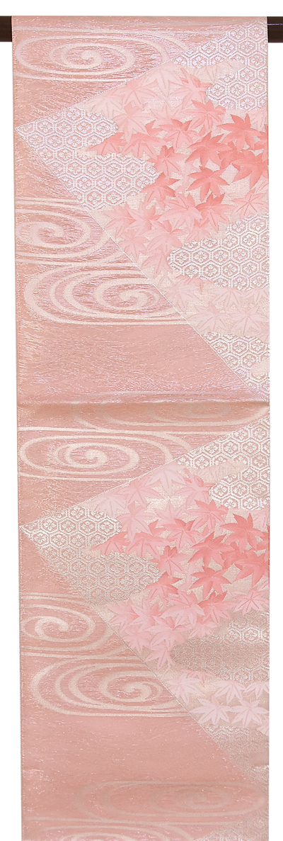 シャリ感のある手触りの紅梅色絽織り地織りに、色紙取り楓の葉柄や観世水の柄を地色濃淡に銀の引き箔を加え重ね織りした品。