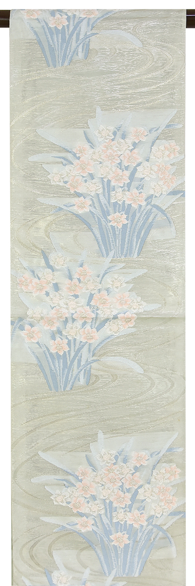 シャリ感のある手触りの薄い青磁色紗織り地織りに、流水に水仙の柄を水色や曙色に金銀糸を加え重ね織りした品。