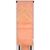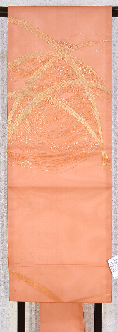 シャリ感のある手触りで確りと打ち込まれた明るい黄丹色の紗織り地織りに、お太鼓の曲線重ねの柄を金の引き箔で重ね織りした品。