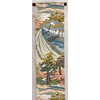 張りのある手触りで確りと打ち込まれたベージュ色の紹巴織り地織りに、建物や木立などの柄を鶸(ひわ)色や朱鷺(とき)色・ハナダ色・京紫などで重ね織りした品。