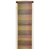 張りのある手触りで確りと打ち込まれた桑染色に緑青色と京紫の縦暈しの色箔糸を重ねた変わり錦地織りに、横段取り曲線柄を鉄紺や紅梅色・辛子色などに金銀や銅色の色箔糸を加え重ね織りした品。