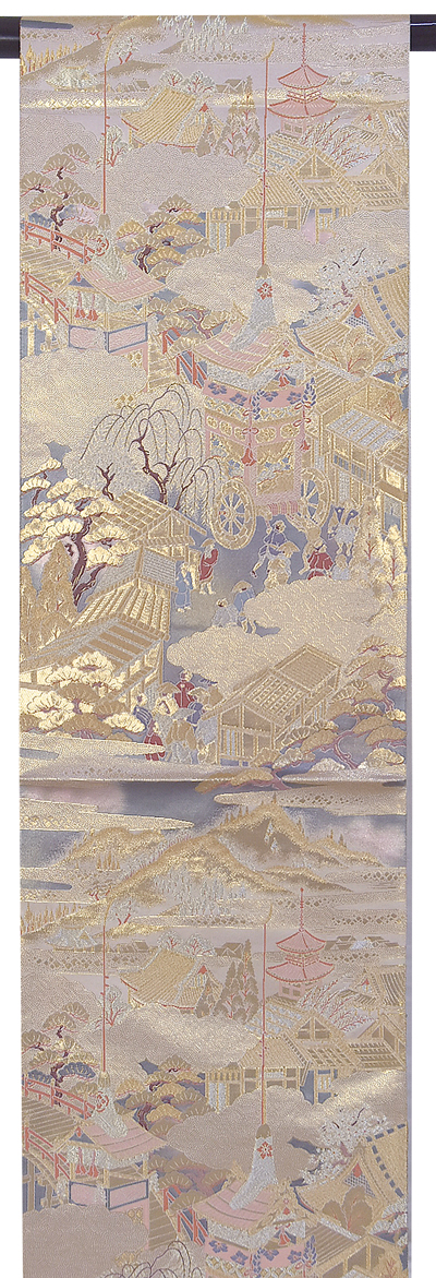 張りのある手触りで確りと打ち込まれた淡いベージュ色の薄手の純金二重箔錦地織りに、祇園鉾や風景の柄を薄ネズに黄赤などに、金糸金箔に銀糸を加え重ね織りした品。